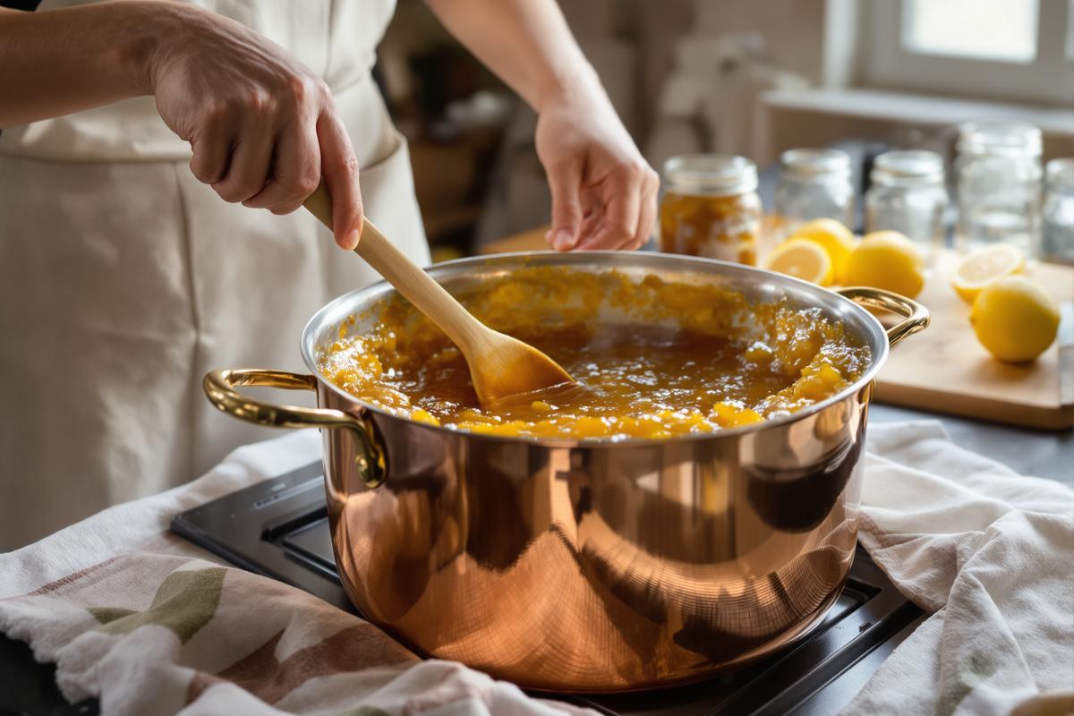 Pendant la cuisson, pense à stériliser tes pots : eau bouillante et séchage tête en bas sur un torchon propre. Dès que la confiture est prête, verse-la encore chaude dans les pots. Ferme-les, retourne-les et laisse-les refroidir lentement.