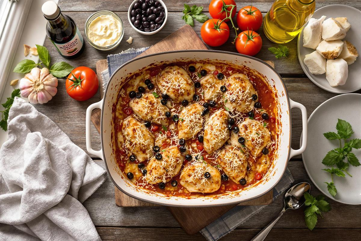 Dans ce plat, chaque ingrédient a sa place. Tu as la tendresse du poulet, la douceur presque sucrée du mascarpone, la fraicheur des tomates… et ce peps des olives noires qui viennent relever le tout. C’est un peu comme une ballade en Méditerranée sans quitter ta cuisine.
